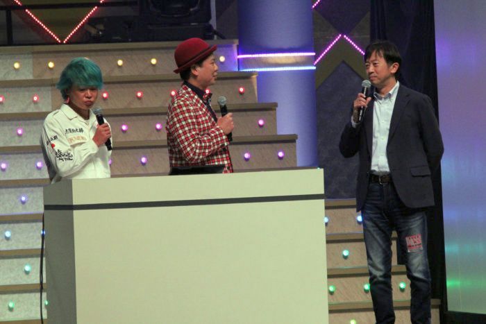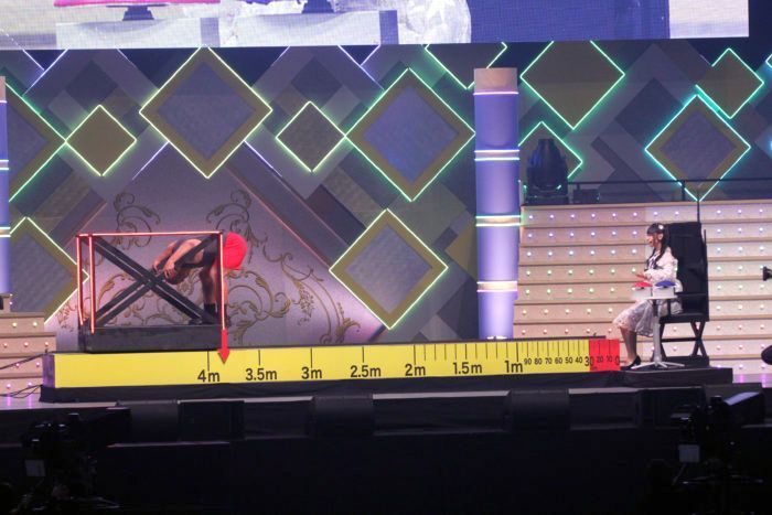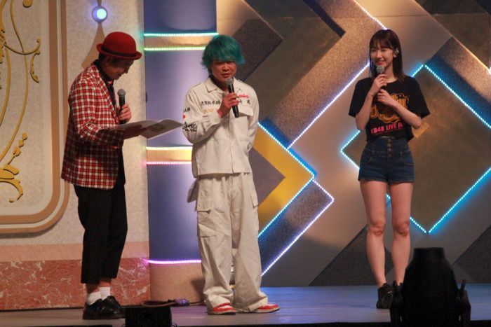 After the traditional AKB48 Overture, the group performed the title song of their upcoming 59th single “Moto Kare Desu” with Honda Hitomi as center followed by “LOVE TRIP” with Okada Nana as center. After “Oosawagi Tengoku,” the game show nature of the concert became apparent as the MC team appeared on stage. The team consisted of Kashiwagi Yuki, who was one of the show stars of AKBingo! and already appeared regularly on the show in the days of AKB 1ji 59fun!, the two co-hosts Kiyoto Oomizo (Bad Boys) and Nakagawa Paradise (Woman Rush Hour) from AKBingo! as well as the long-time producer Mori Shinobu. A video featuring famous AKBingo! Games introduces the segment and selected members could showcase their variety talent in 15sec.